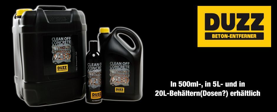 Duzz entfernt Betonablagerungen von allen Arbeitsgeräten und Oberflächen. Duzz im 5-Liter-Container ist für den (Baustellen-)örtlichen Gebrauch und große Projekte optimal. Mehr Info